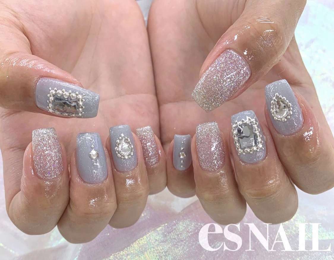 さまざまな形のストーンをビジューのように飾るネイルデザイン。