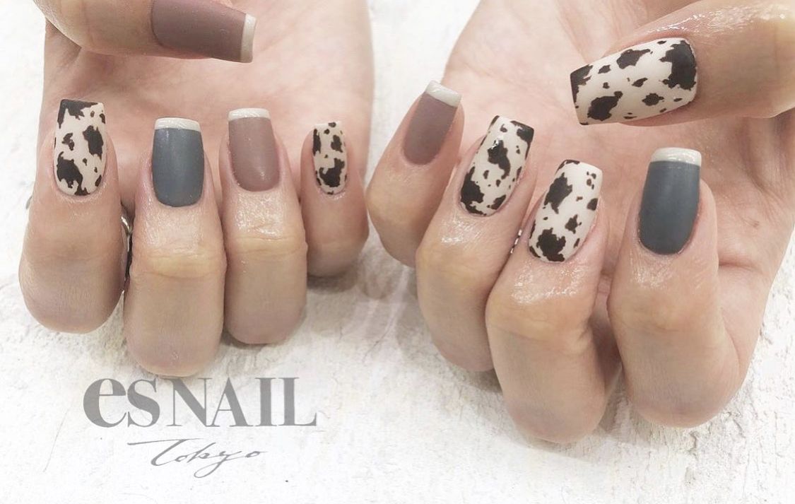 2021年丑年ということもありネイルデザインも牛柄が大人気!!!ダスティカラーをベースに、アニマル柄をポイントでおいてあげることで一気にトレンドをおさえ、こなれ感もup!アイボリーのラインフレン…